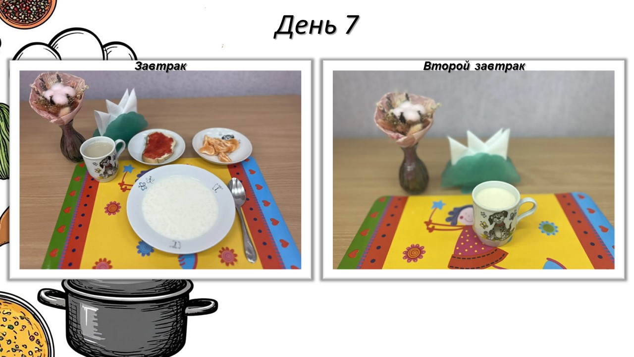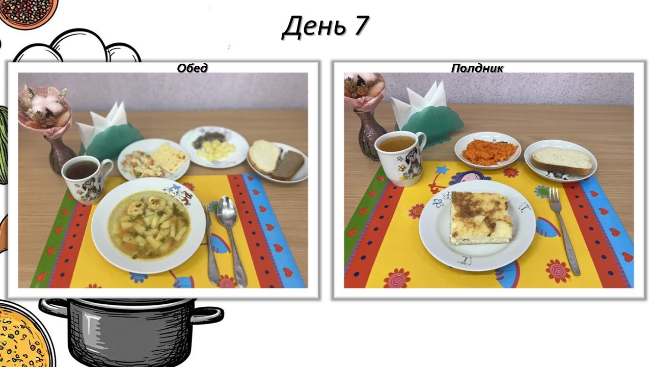 В каждой группе вывешивается меню на каждый день, подписанное заведующим детским садом. Меню сбалансировано по белкам, жирам, углеводам, выведены калории.